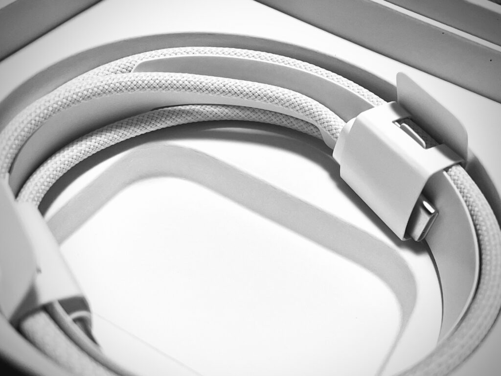 見た目もさわり心地もヘビみたいな付属のType-C to Type-Cケーブル。ヘビを触ったことはないけど。