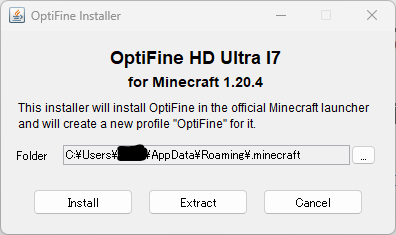 その後、再度OptiFine_1.20.4_HD_U_I7.jarをクリックして開き、InstallからOptiFineをインストールする。