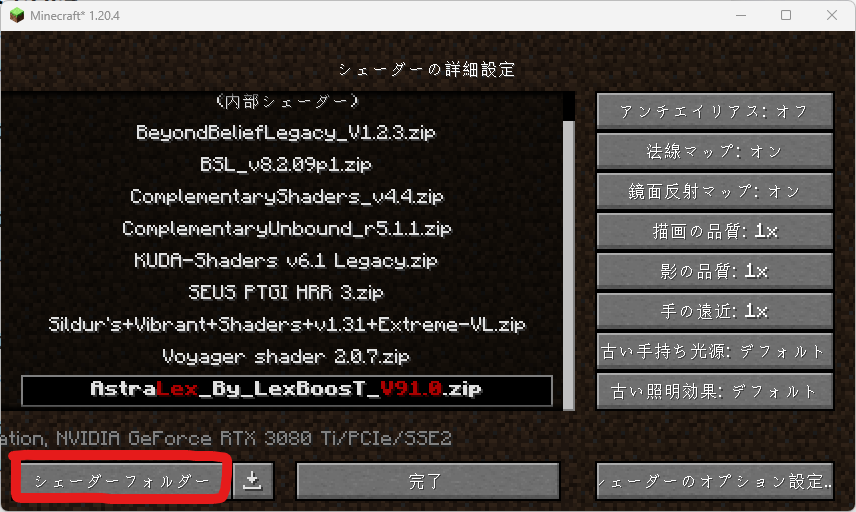 ざっくり、前提MODのOptiFineのインストールと、シェーダーパックを入れる。