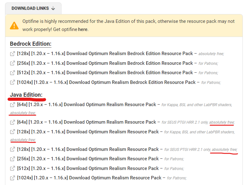 Java Editionのものをダウンロードする。64xより128xのほうがより高解像度だが、PCへの負荷が高くなる。
