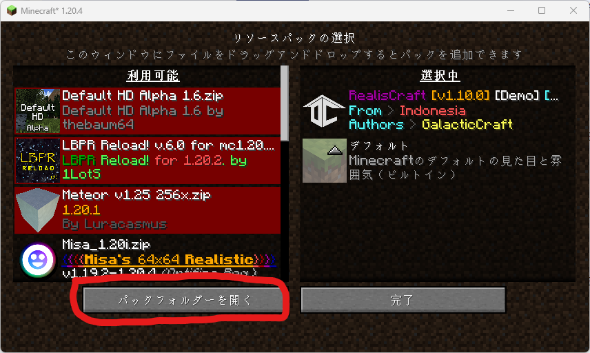 ダウンロードしたリソースパックをMinecraftに入れるには、Minecraftを起動し、設定>リソースパック>パックフォルダーを開く から開かれたPCのフォルダにダウンロードしたリソースパックをzip形式のまま入れる。