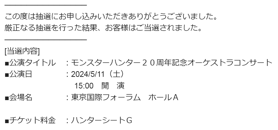 モンハンのオーケストラを浴びさせろで言っていた「モンスターハンター20周年記念オーケストラコンサート ~大狩猟音楽祭~」の東京公演の先行抽選結果が出た。